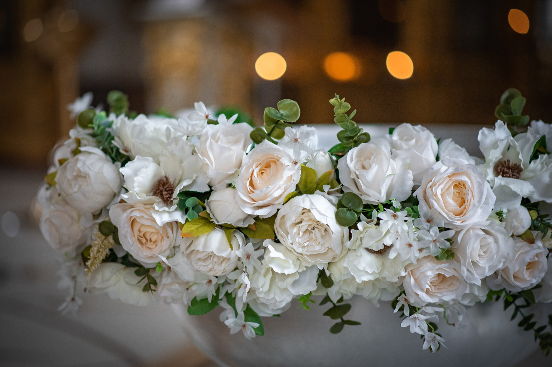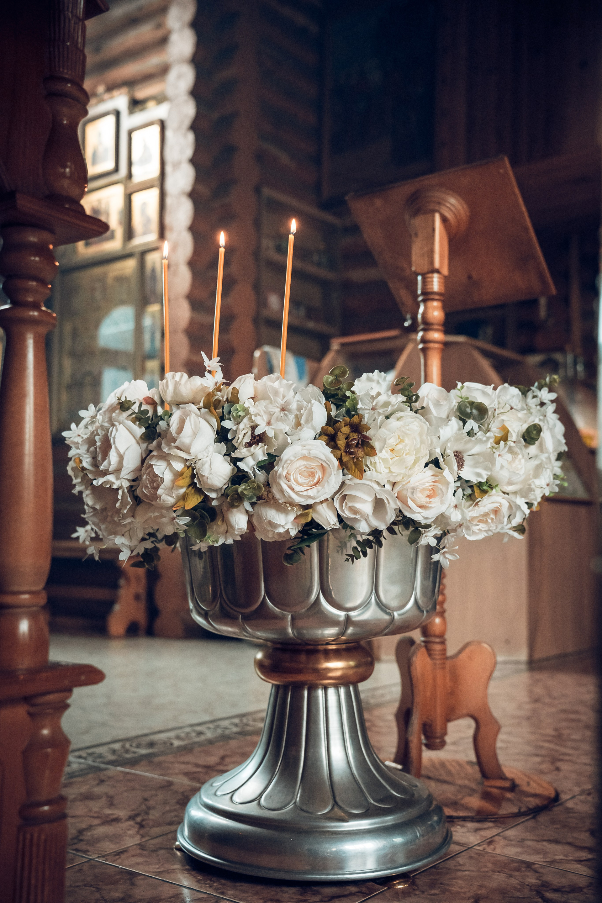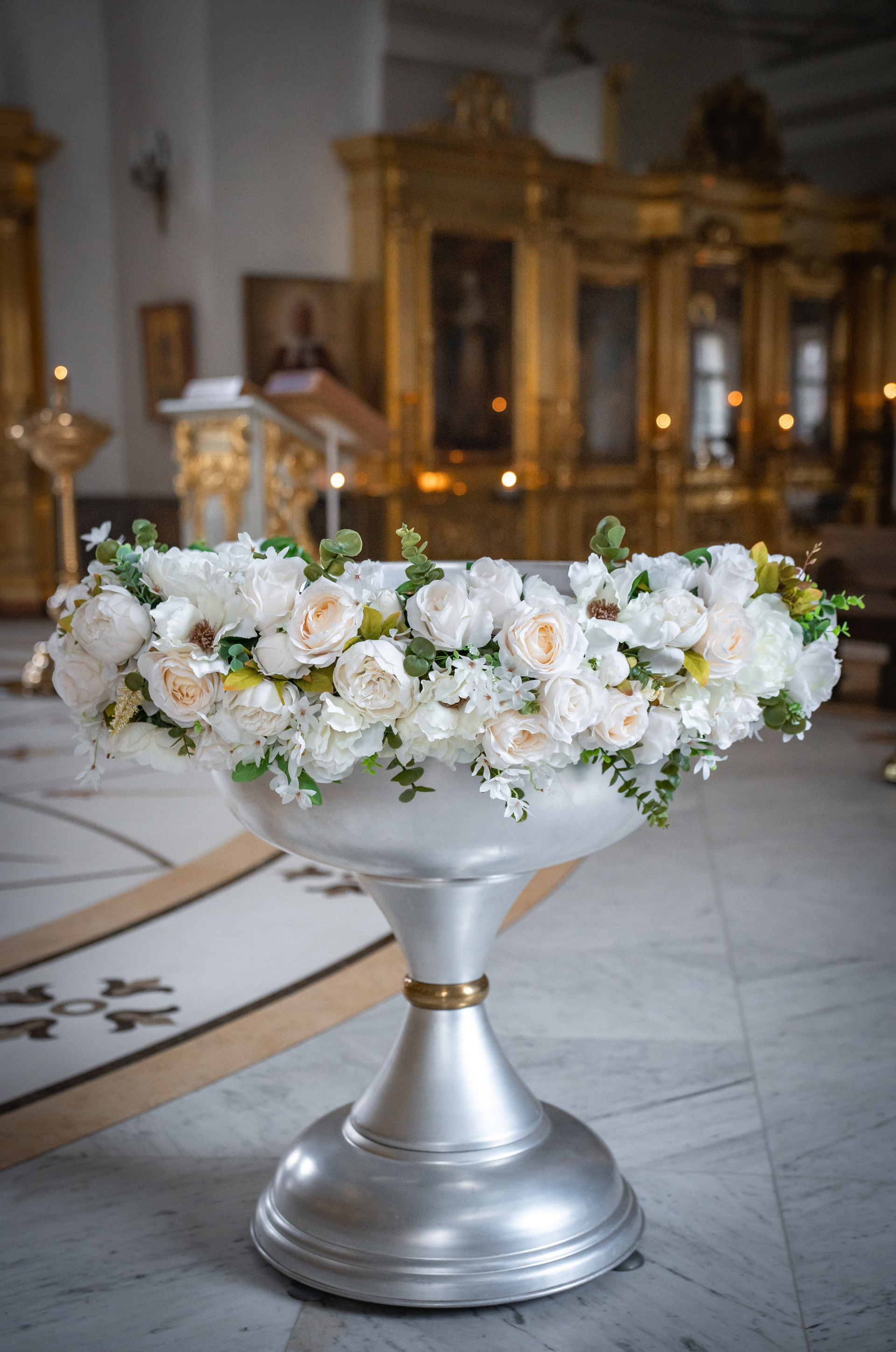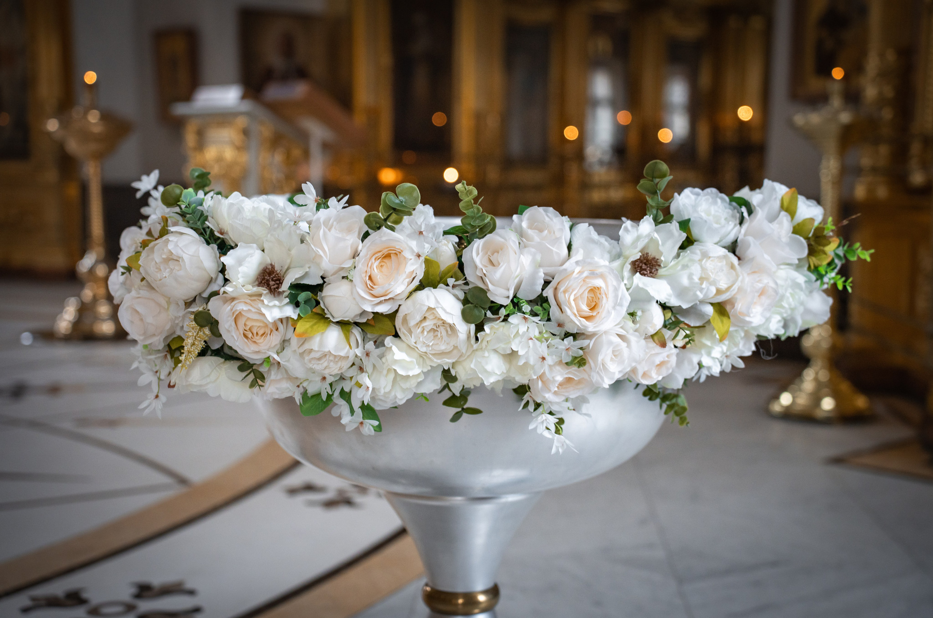 Монтаж флористического украшения декоративными интерьерными цветами, которые просто невозможно отличить от живых, не требует много времени, и Вам не нужно будет согласовывать дополнительное время в храме.